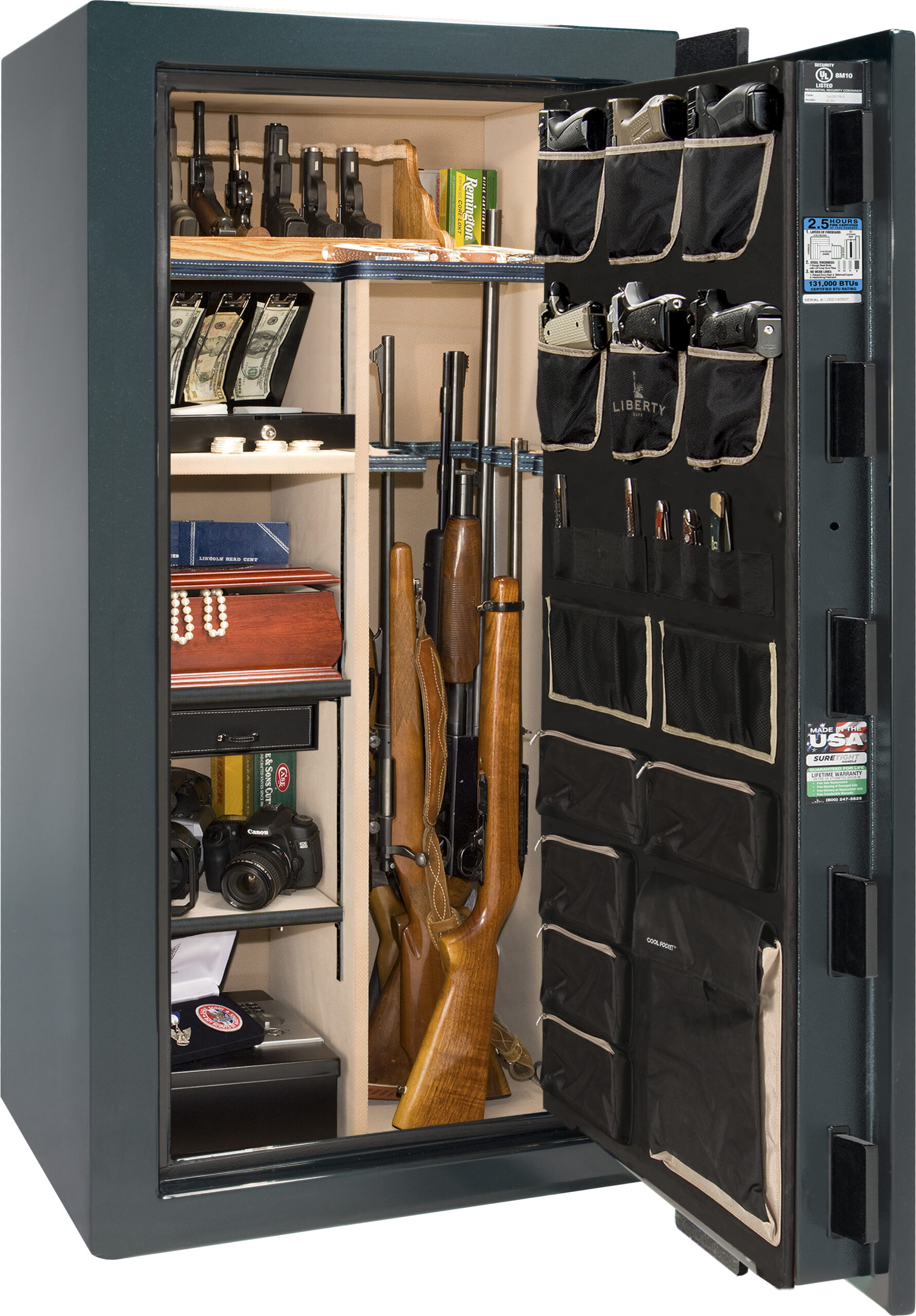 As implied by the name, fire safes keep your valuables protected in the event of a fire. These safes have a fire-resistant design and are perfect for storing important documents, memorable items from your family’s history and other high-value items. Many of these safes have warranties and guaranteed protection against fire, so be sure to ask about it when you’re shopping. (Liberty and Browning are two trusted brands for fire safes, FYI.)